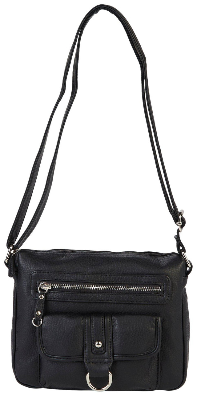 This crossbody handbag features a solid color design on soft, grainy washed, vegan leather fabrication, one front snap flap pocket with D-ring detail, one zipper pocket, one rear slip pocket, a crossbody adjustable strap, and a top zipper closure. The lined interior contains one zipper pocket and two slip pockets. Handbag measures approximately 9 in. L x 2 in. W x 7.5 in. H.