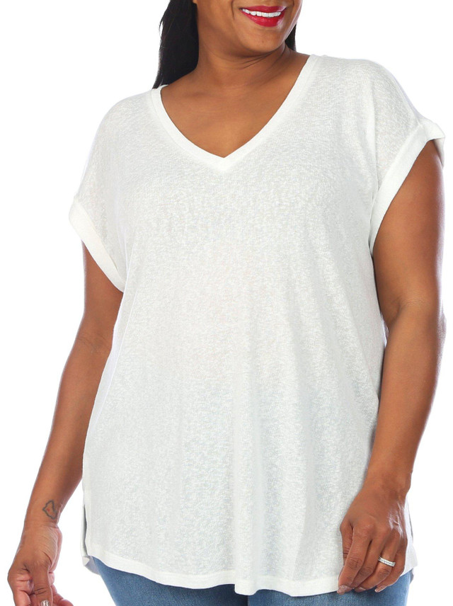 This short sleeve top features a solid color design on soft lightweight knit fabric, a v-neckline, cuffed short cap sleeves, and side split hi-lo hem. The top length measures approximately 28 in. Fabrication 55% polyester and 45% rayon.