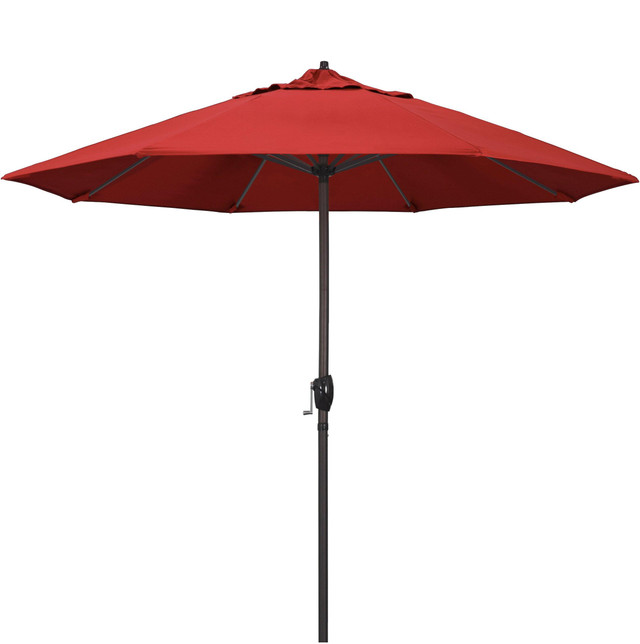 This large 9 foot umbrella offers the residential owner a beautiful market design. The aluminum frame has a simple crank to open and auto tilt design. Umbrella features aluminum pole and 8 heavy duty aluminum ribs. Olefin fabric features synthetic fibers & 40+ UPF. Base to top measures: 102''.