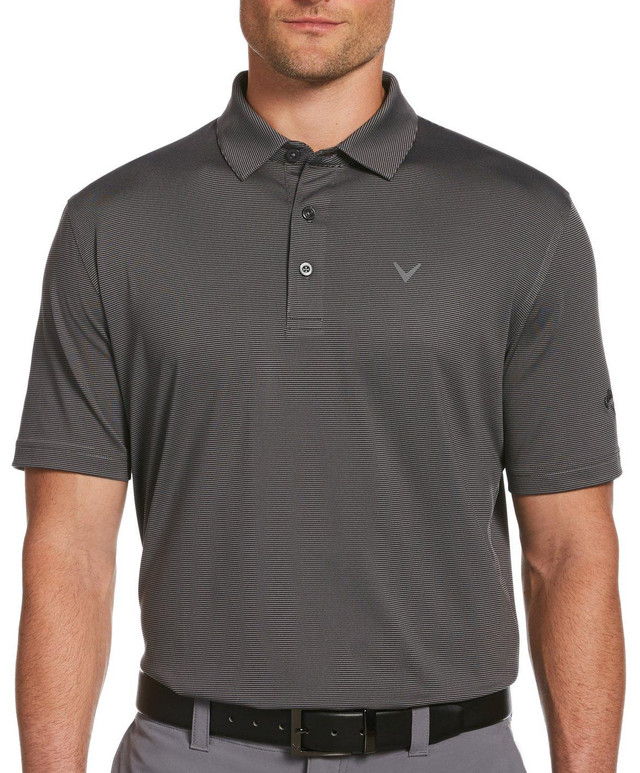 This short-sleeve golf polo shirt features a stripe design, lightweight & flexible fit, logo graphic print on the chest & sleeve, and a three-button placket.