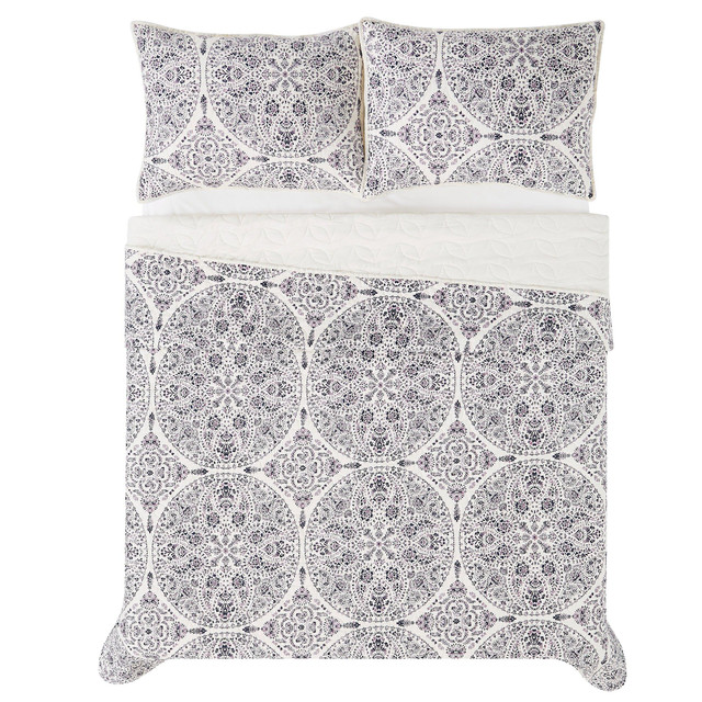 This stunning printed bedding set features a watercolor medallion print that is elevated by the paisley pattern within that brings a modern feel to a classic design. The soft, silky feel to this set is provided by the 100% microfiber fabric that is easy to maintain and machine washable. Set includes: 1 Comforter and 2 Shams (1 for Twin/Twin XL).