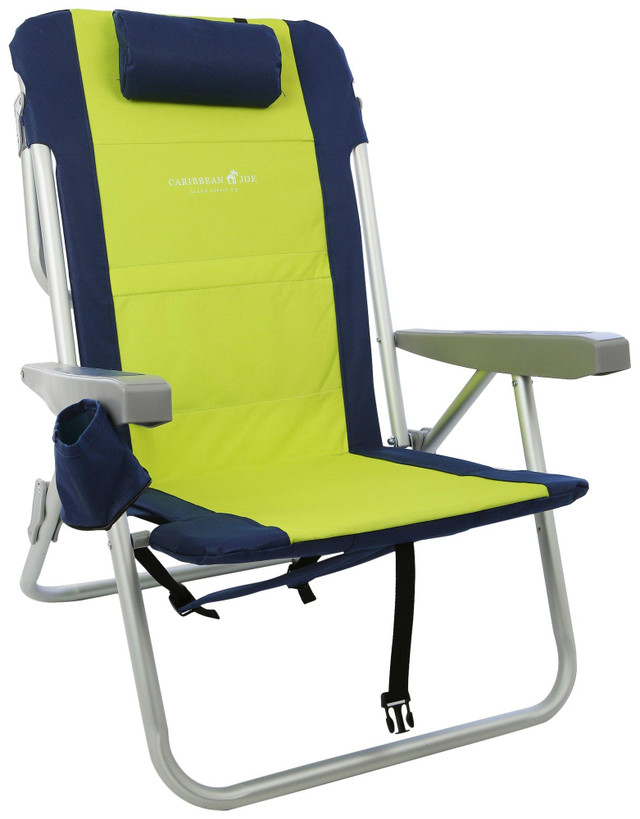 Youll be ready for any beach adventure in this practical canopy high back beach chair. Features 5 adjustable reclining positions, rust proof aluminum frame, easy-carry backpack straps, fade resistant polyester fabric, and a maximum weight capacity of 300lbs. Also features a pillow headrest, cup holder, and double back zipper compartments. Measures 24 in x 25.5 in x 30 in.