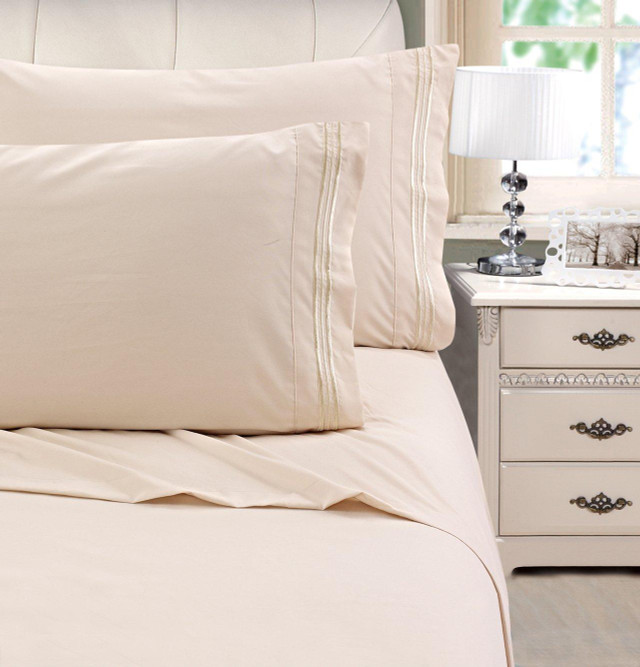 Silky soft, this Cathay Home three-piece polyester microfiber sheet set includes one solid flat sheet, one solid fitted sheet and two embroidered standard pillowcases (one for twin size).