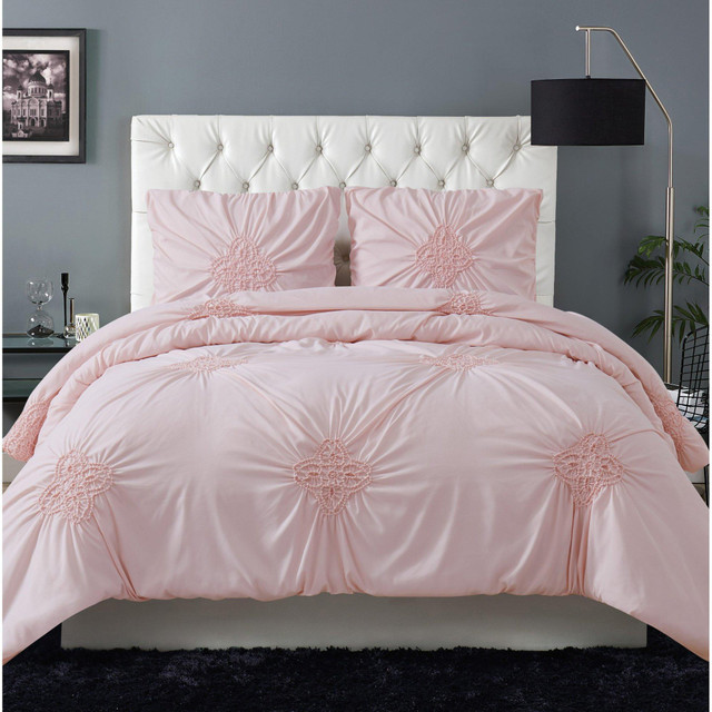 Add a bit of color and texture to your bed with this large rouched medallion solid color pattern. Face and back of the duvet and pillow shams is 100% microfiber polyester with a rouched face pattern. Set includes duvet cover and 2 pillow shams.