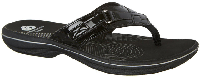The Clarks Cloudsteppers Breeze Sea flip flops are soft, comfortable, supportive, and a customer favorite. These lightweight flip flops have soft EVA printed footbeds, adjustable strap, patent leather finish, and a 1 in. heel. Relax in effortless style for a carefree, casual and comfortable day.