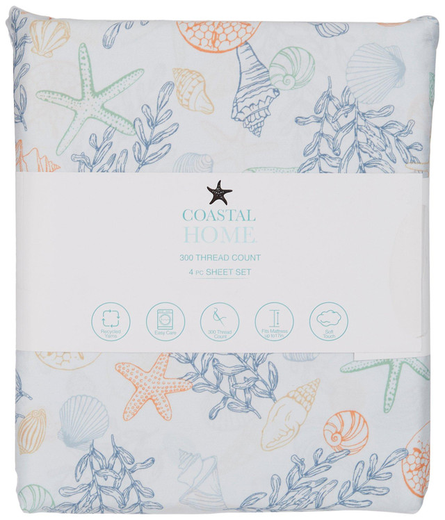 Coastal Home adds a touch of coastal style to your home decoration. This sheet set features a fun seaweed & shell print design, made with recycled yarns, soft to the touch and fits up to a 17in mattress. 300 thread count. Set includes one fitted sheet, one flat sheet and two pillow cases (one for twin size). Fabrication 55% cotton, 45% recycled polyester.