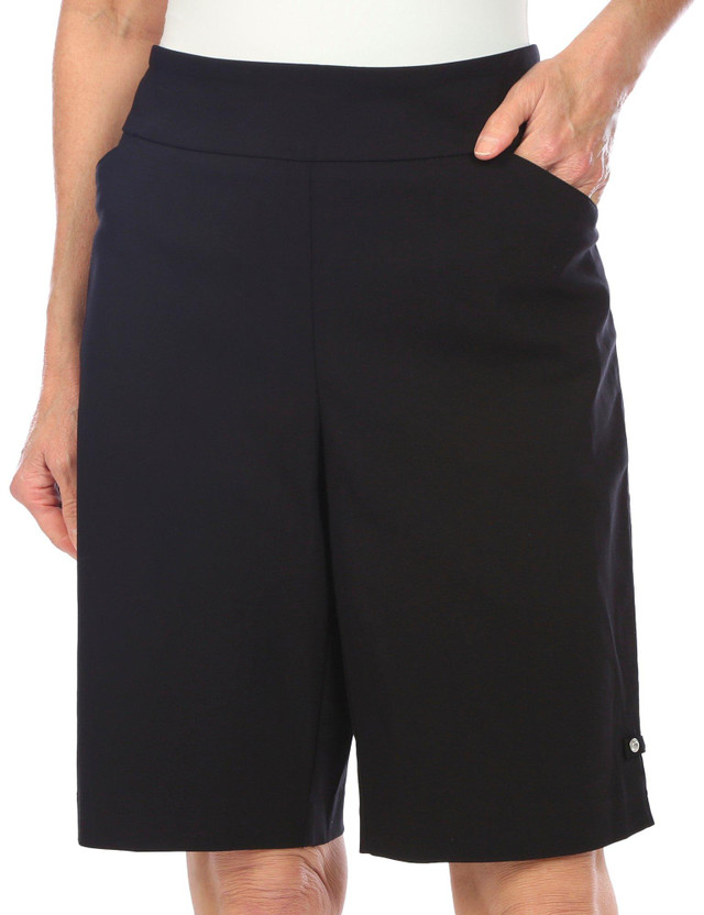 These easy-care shorts feature a solid color design on lightweight comfort stretch fabrication, two front pockets, wide hidden elastic waistband, pull-on styling, and a decorative diamond detail at the side split hem. Fabrication 75% rayon, 22% nylon, 3% spandex