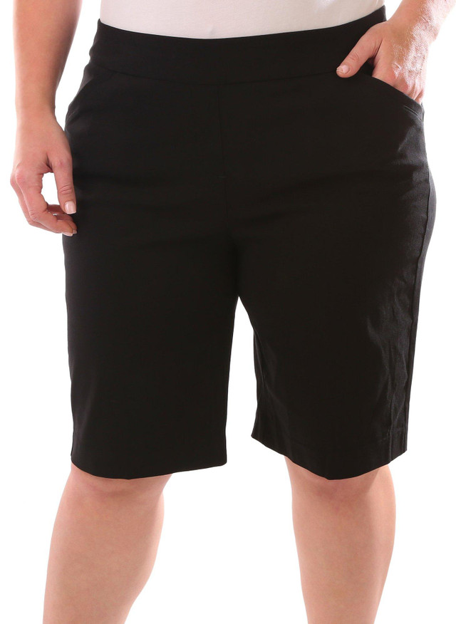 These pull-on shorts feature a solid color design on lightweight comfort stretch knit fabric, a hidden elastic waistband wiith slimming tummy panel, front pockets, two faux back pockets, and a classic fit. The inseam measures approximately 11 in. Fabrication 75% rayon, 22% nylon, 3% spandex.