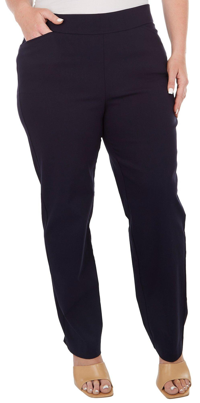 These pull-on pants feature a solid design on lightweight comfort stretch fabric, a hidden elastic waistband for optimal comfort, a slimming tummy panel, two front pockets, two back pockets, and slim fit. Inseam measures approximately 28 inches. Fabrication 75% rayon, 22% nylon, 3% spandex.