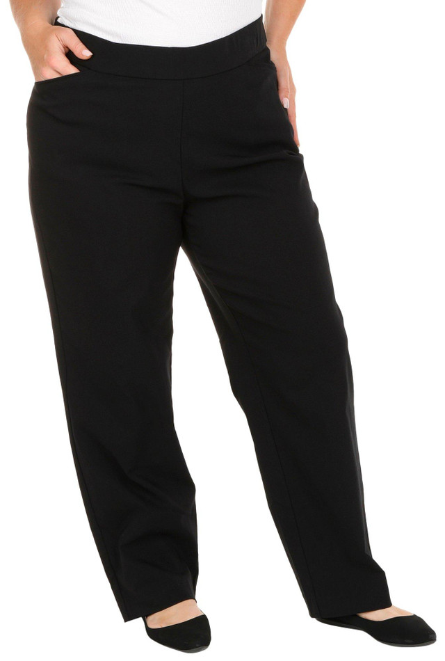 These pull-on pants feature a solid design on comfort stretch fabric, a hidden elastic waist, slimming tummy panel, two front slip pockets, and a classic fit. Inseam measures approximately 29 inches in length. Fabrication 75% rayon, 22% nylon, 3% spandex.