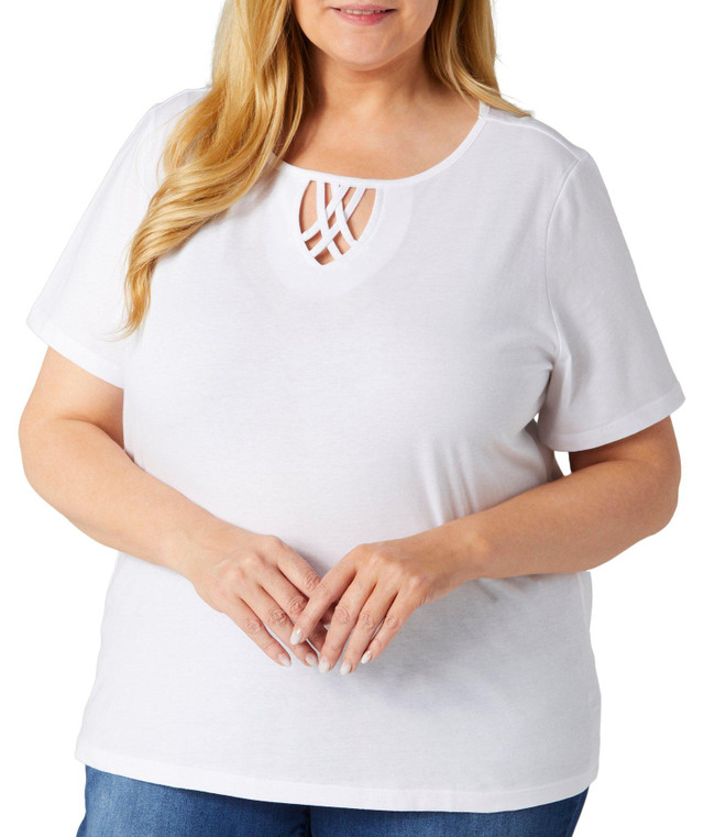 Add a stylish twist to your wardrobe with the Plus Keyhole Neckline Short Sleeve Top, expertly crafted from 100% breathable cotton for all-day comfort. This top features a trendy keyhole neckline that adds a touch of sophistication, while the short sleeves ensure effortless wearability. Perfectly tailored for a flattering fit, its ideal for curating both casual and semi-formal looks.
