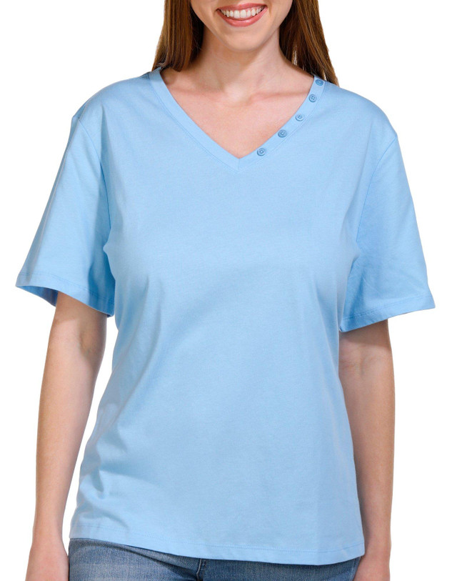 Coral Bay offers classic casual collections for your relaxed lifestyle. This short sleeve top features a solid color design on lightweight knit fabric, a V-neckline with decorative button detail, and classic styling. The top length measures approximately 25 in.