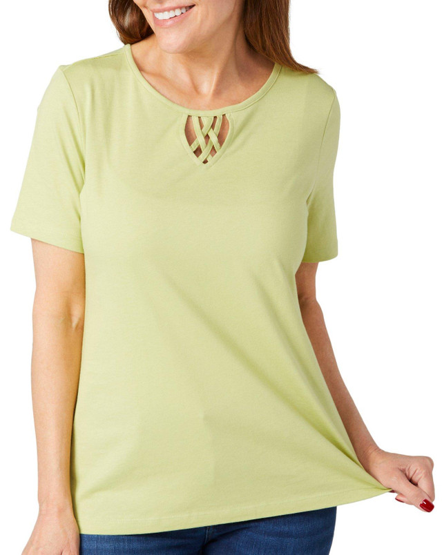An effortless blend of elegance and ease, the Womens Solid Woven Keyhole Short Sleeve Top is that go-to piece that makes getting dressed feel seamless. The airy woven fabric drapes beautifully, offering just the right amount of movement, while the delicate keyhole detail adds a touch of intrigue without trying too hard. The top length measures approximately 26 in. Fabrication 100% cotton.
