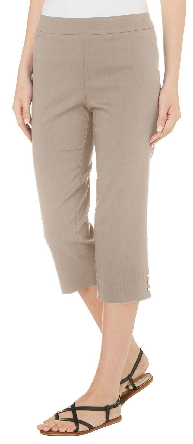 Counterparts offers a stylish look and a comfortable fit. These capris feature a solid color design, a flat front, and a side button accents at hemline. Inseam measures approximately 20 inches.
