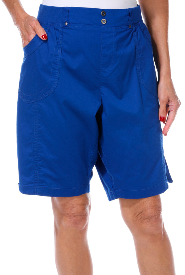 These shorts feature an elastic ribbed waistband with one button closure, two front pockets, two back slip pockets, a drawstring at side hemline, lightweight woven fabric, and a solid color design for effortless matching. Inseam measures approximately 10 in. Outseam measures approximately 20 inches from waistband to hemline. Fabrication is 98% cotton and 2% spandex.
