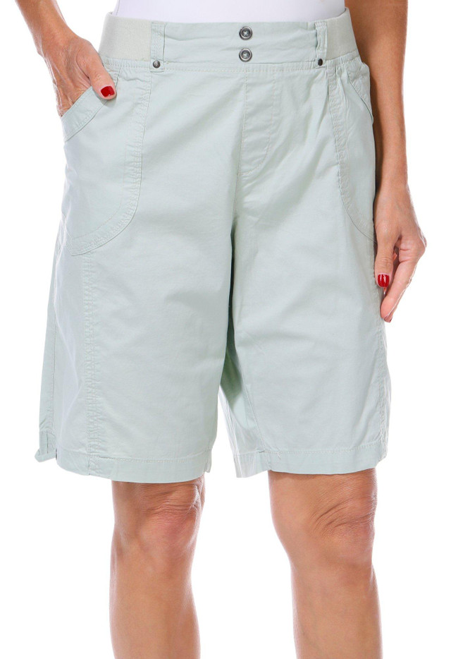These shorts feature an elastic ribbed waistband with one button closure, two front pockets, two back slip pockets, a drawstring at side hemline, lightweight woven fabric, and a solid color design for effortless matching. Inseam measures approximately 10 in. Outseam measures approximately 20 inches from waistband to hemline. Fabrication is 98% cotton and 2% spandex.