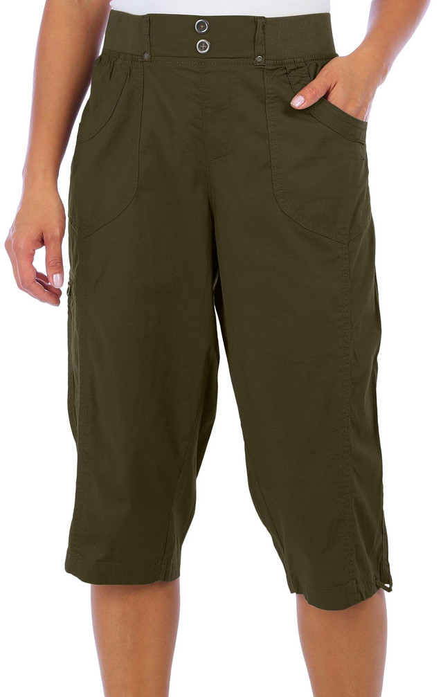 These capris feature an elastic waistband with a two button detail, two front and back pockets, and a solid color design for effortless matching. Inseam measures approximately 21 in. Fabrication is 98% cotton and 2% spandex.