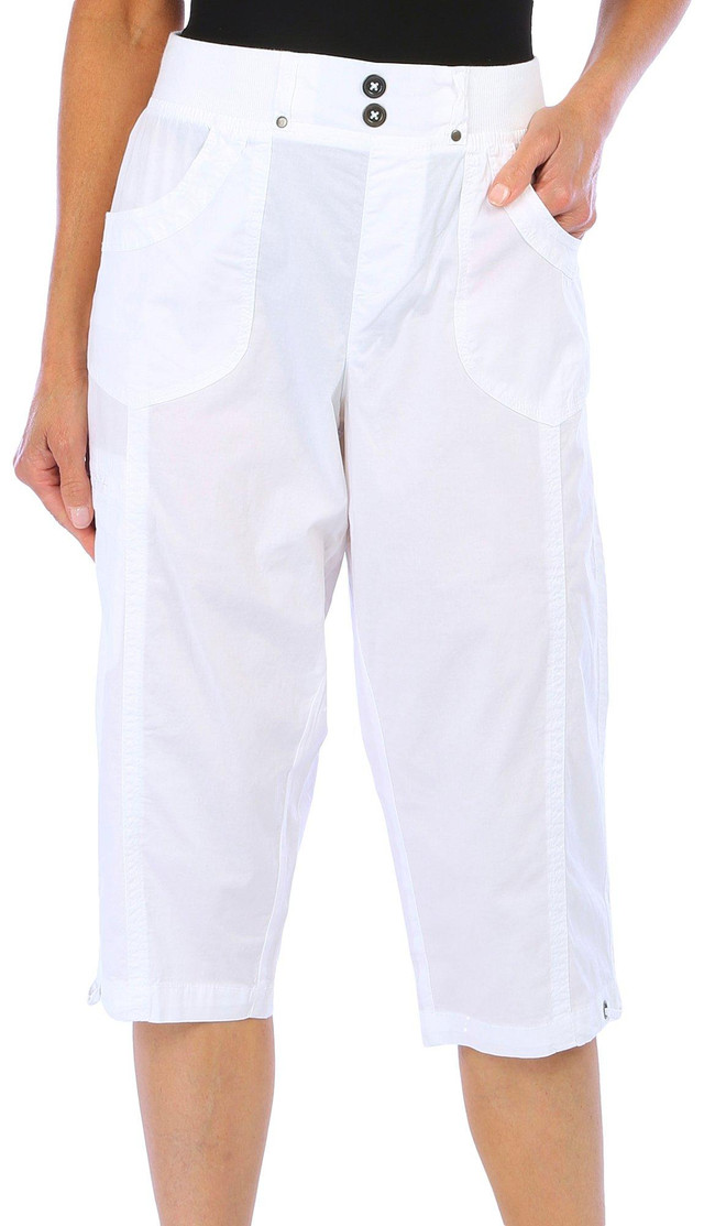 These capris feature an elastic waistband with a two button detail, two front and back pockets, and a solid color design for effortless matching. Inseam measures approximately 21 in. Fabrication is 98% cotton and 2% spandex.
