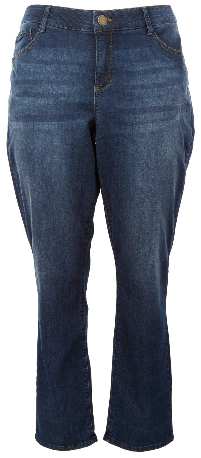 These Democracy jeans feature a whiskered design on lightweight denim fabric, a stretch waistband, built-in Ab-technology, one-button and zipper closure, and five-pocket styling. The inseam measures approximately 31 in. The outseam measures approximately 38 in. Fabrication 54% cotton, 27% rayon, 17% polyester, 2% spandex.