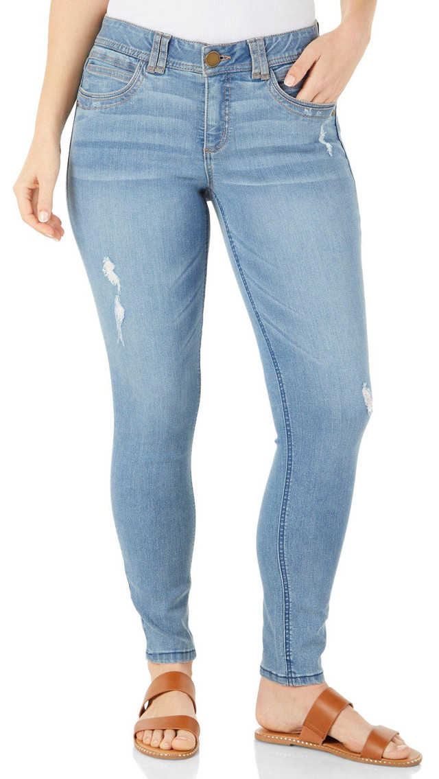 The Womens 30 in. Ab-Tech Elastic Waist Skinny Jeans combine comfort and style effortlessly. Crafted from a blend of 54% cotton, 27% polyester, 17% rayon, and 2% spandex, these jeans offer a stretchy, soft fit that moves with you. The Ab-Tech elastic waist provides a flattering and secure fit, while the skinny leg design creates a sleek, streamlined silhouette. With a 30-inch inseam, these jeans are perfect for pairing with any top for a chic, everyday look.