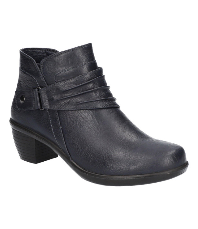 Easy Street's stylish Damita bootie, designed with a fashionable rusched overlay upper and accented with a single nail head ornamentation. The lightweight and flexible outsole offers unrivalled Easy Motion by Easy Street comfort heel to toe foam insole. Inside zipper for easy entry.