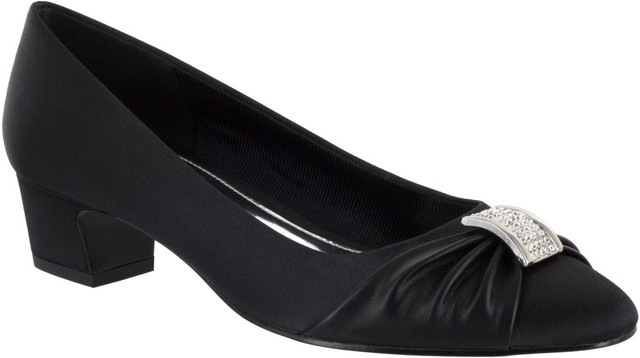 The Easy Street Eloise has a man-made PU upper with a jeweled metal ornament. The pump has a padded tricot lining, man-made insole with foam padding & Easy Flex rubber blend outsole or leather outsole. This shoe has satin detailing and a leather sole.