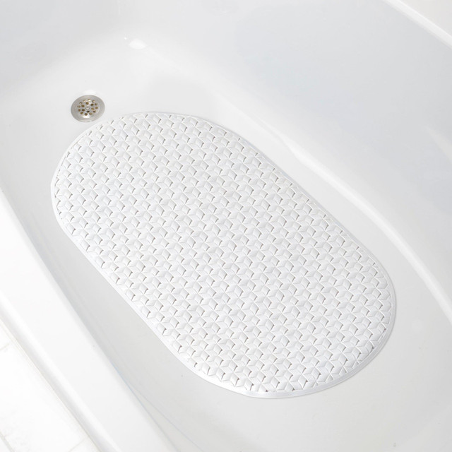 This bathmat brings a premium feel to your bathtub! Features skid resistant suction cups and is composed of an agent that is resistant of mildew. Fabrication is 65% recycled elastomer and 35% thermoplastic elastomer. Measures 27.5in x 15.in.