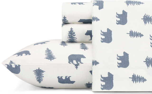 Add an extra layer of warmth to your bedding ensemble with this Bear & Trees flannel sheet set from Eddie Bauer. Sheets feature graphic silhouettes of bears and evergreen trees. Set includes flat sheet, fitted sheet, and 2 pillow cases (1 twin).