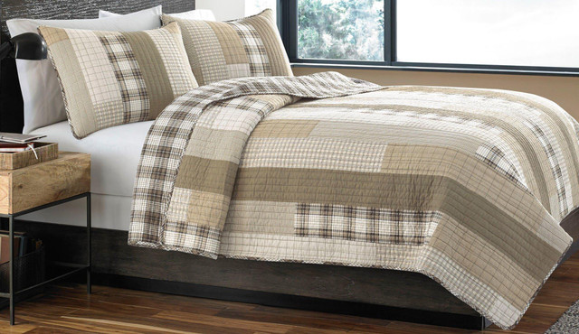 Fairview Saddle quilt set features perfect plaids are printed in an irregular stripe a thoroughly modern twist on a patchwork design. Set includes qulit, and 2 pillow shams (1 in twin set).