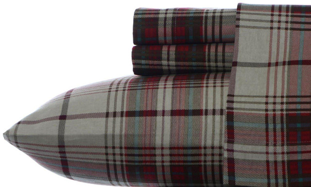 Eddie Bauer Montlake Plaid Flannel Sheet Set will keep you warm and in style this fall. King flannel sheet set includes one flat sheet 108'' x 102'', one fitted sheet 78'' x 80'' and two pillowcases 40 x 20. Fitted sheet pocket is 14.