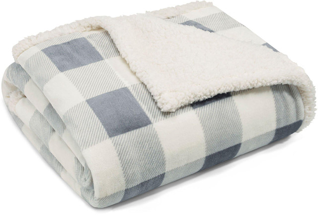 Printed on all polyester, this decorative throw blanket features a classic plaid pattern in shades of white and grey. Throw reverses to a plush sherpa fleece for comfort. Measures 50'' x 60''.