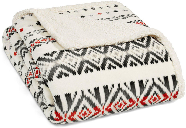 Printed on all polyester, this decorative blanket features a classic wintery geometric pattern in shades of red, black, and white. Blanketrow reverses to a plush sherpa fleece for comfort.