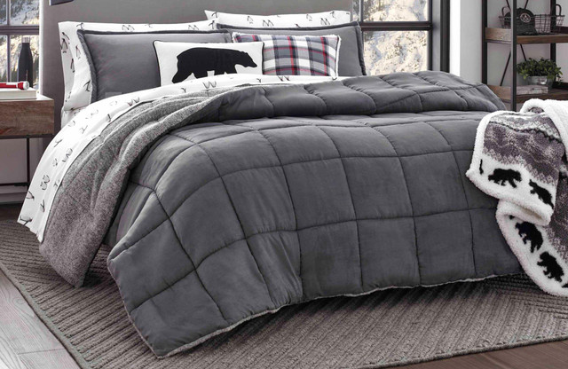 Featuring polyester and micro-suede constructionl, this comforter set features a classic soild grey color with a heathered grey sherpa reverse. Set includes comforter and two pillow shams (one for twin).