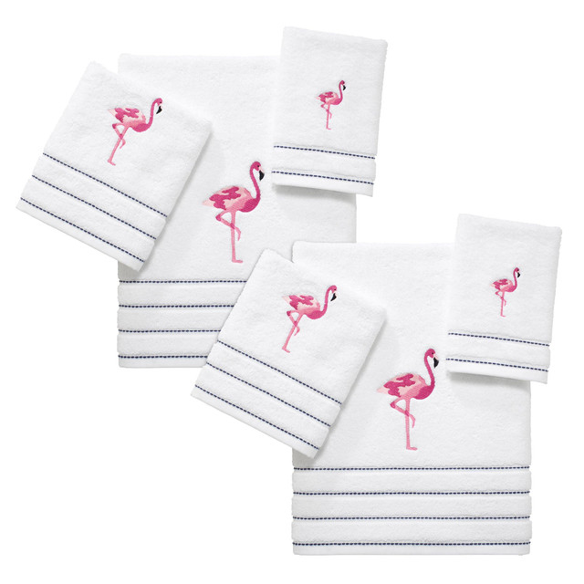 The Izod Flamingo Bath Towel Set features an intricately embroidered pink flamingo standing on one leg on a white terry ground with coordinating navy blue ticking stripes. Coordinating rug and shower curtain available. Available in a set of 2 bath towels, 27 x 54, or a set of 2 hand towels, 16 x 28, or a set of 2 fingertip towels, 11 x 18. Update your Coastal bathroom with these soft and absorbent towel sets. Shop the entire Flamingo Bath Collection.