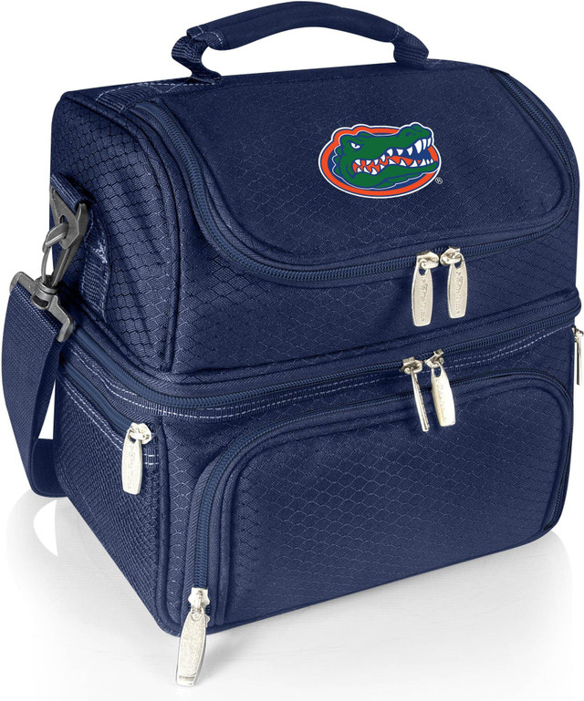 The Pranzo insulated lunch box is made of polyester and features adjustable shoulder strap, soft grip handle, side mesh pockets, and a hidden flatware section with 1 stainless steel fork, knife, and spoon, salt & pepper shaker and 1 cotton napkin. Measures 12''L x 8''W x 11''H.