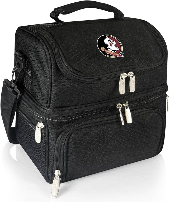 The Pranzo insulated lunch box is made of polyester and features adjustable shoulder strap, soft grip handle, side mesh pockets, and a hidden flatware section with 1 stainless steel fork, knife, and spoon, salt & pepper shaker and 1 cotton napkin. Measures 12''L x 8''W x 11''H.