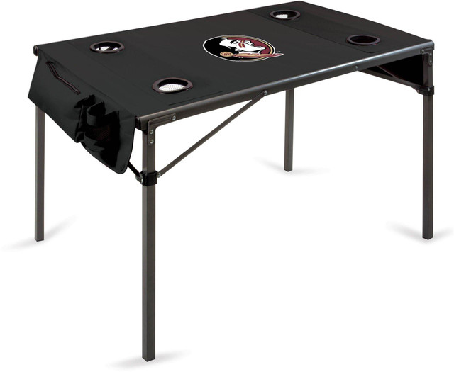 This FSU Travel Portable Folding Table,is the ultimate compact folding table for camping, tailgating, beach days, picnics at the park and bbqs! It features high quality components including a sturdy polyester canvas skin that stretches over a durable, powder-coated steel frame. The frame folds inward to pack easily into a drawstring bag with a shoulder strap. Includes 4 drink holders, a zippered pouch, and beach umbrella hole for build-in shade.