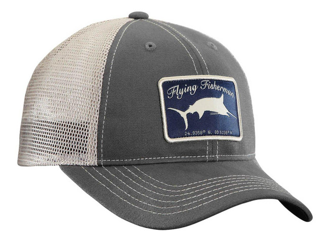 Flying Fisherman Marlin trucker cap in graphite with stone mesh back. Adjustable velcro closure. Curved bill with stone contrast stitching. Dark Non-glare under visor. One size fits most. Marlin Woven Label Patch featured on Dark Graphite crown with Stone colored mesh back. Flying Fisherman logo tag on back.