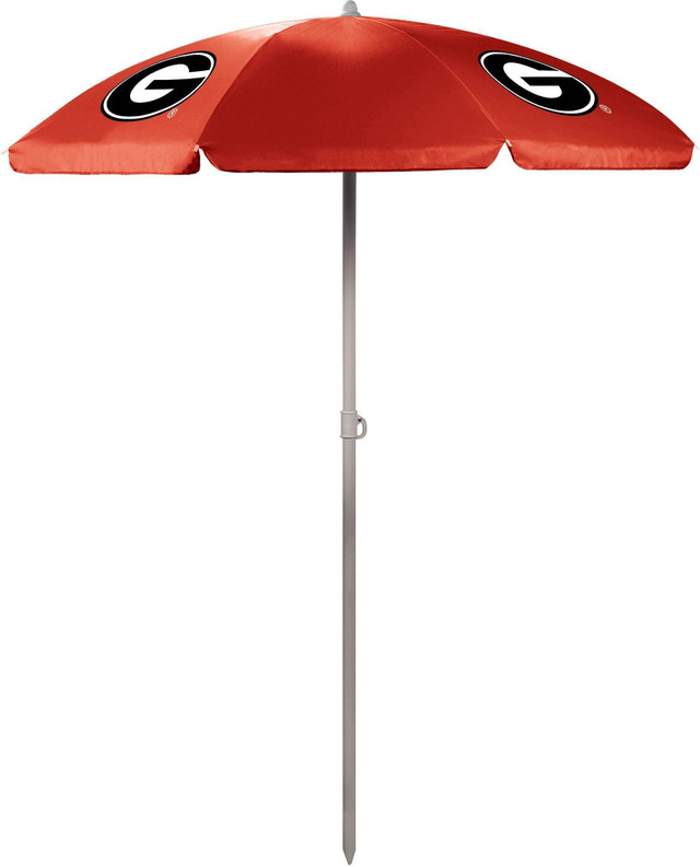 This umbrella is perfect for the beach, tailgating, or picnics. The pole measures 81.5'' tall and 1.25'' diameter with a tilting option as well as pointed end for easier penetration into the ground. Umbrella measures 5.5' across. Sturdy drawstring bag with strap included.