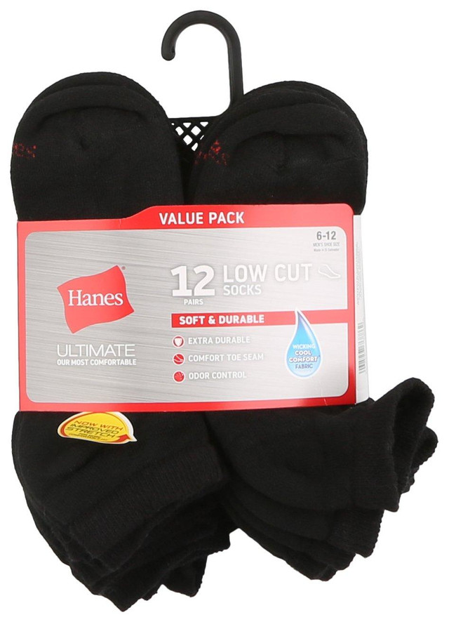 These 12-pair Ultimate Low Cut Socks come in a solid color design on a cotton blend knit fabrication. Socks are extra durable with reinforced toe and heel, odor control to help fight stinky feet, wicking to help feet stay cool and dry, and a comfort toe seam. Fits mens shoe size 6-12, sock size 10-13. Contains 8 pairs low cut socks. Fabrication is 46% cotton, 45% polyester, 7% rayon, 1% spandex, and 1% nylon.