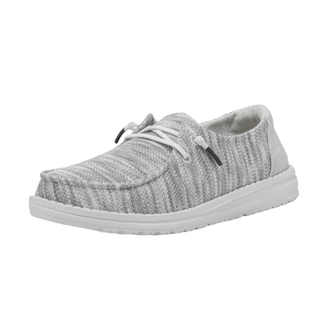 These classic Hey Dude Wendy Slip On Casual Shoes are constructed in breathable fabrics without compromising support. They feature no-tie elastic laces, rounded toe, and EVA outsole. An ergonomic, removable memory-foam insole gives all day comfort. Machine washable in cold water and air dry. Easy, breezy, on the go styling.