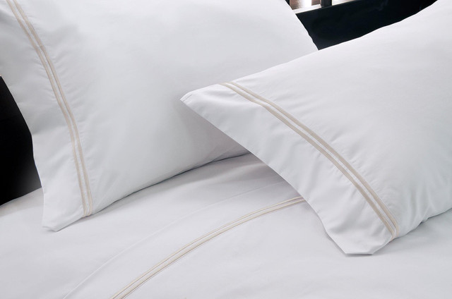 Give your sleep space a refined, luxurious look with the 1200-Thread-Count Cotton Sheet Set from Hotel Suite. Featuring stylish embroidery in a contrast color on a clean white background. Set includes 1 flat sheet, 1 fitted sheet (fits up to 16 inch deep mattress), and 2 pillowcases (1 twin). 55% cotton 45% polyester.