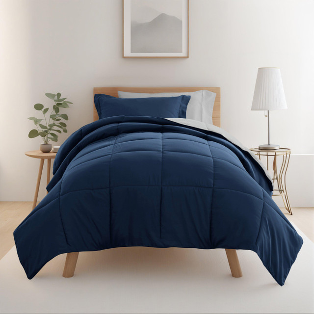 Prepare for college life with the Ultimate College Essentials Bedding Bundle. This all-in-one set features a versatile solid reversible comforter, allowing you to switch between two colors to match your mood or dorm decor. TwinXL - Bundle Contents and Size Guide: 1 Laundry Bag (20 x 28), 2 pillows (20 x 28), 70 x 90 Comforter, 20 x 26 Pillow Sham with 2 flange, 1 flat sheet (66 x 102), 1 fitted sheet (39 x 81 x 16) and 1 pillowcase (20 x 30). Machine Wash Cold.