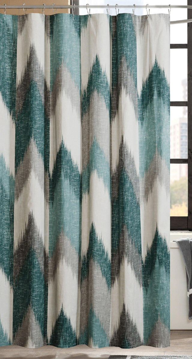 Alpine Shower Curtain by Ink & Ivy features a broken chevron print in multiple shades of color. Curtain design is printed on 200 thread count cotton. Measures: 72'' x 72''.