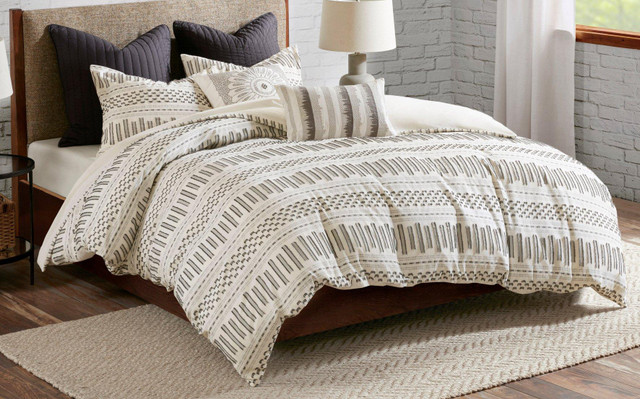 The ivory cotton comforter features horizontal stripes, in charcoal hues, with eyelash-looking woven details that add a charming accent to the top of the bed. Hidden bartacks create a clean, duvet-like finish on the comforter. Set includes comforter & 2 standard pillow shams.