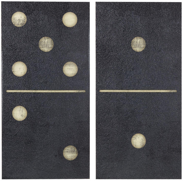 Two Black Dominos by artist Rain Shanks is a dynamic and alluring two-piece set. The large dominos are printed on canvas with a gel coated application for added texture. Each piece measures 18''L x 36''W x 1.5''H.