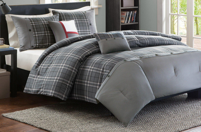 Add a touch of bold, chic patterns to your bedroom with the Intelligent Design Daryl Comforter Set. This set features an mixed plaid and gingham design with button accents. Set includes one comforter, two decorative pillows, and two shams (one for twin size). Pillows measure 12''L x 16''W and 16''L x 16''W.