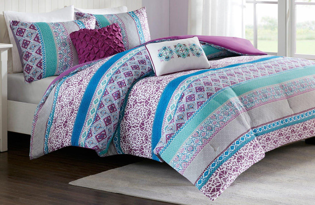 The Intelligent Design Joni Coverlet Set features gorgeous hues of purple, blue, turquoise, and grey with a global inspired pattern. Set includes a coverlet, two shams (one twin) and two decorative pillows measuring 12'' x 16'' and 16'' x 16''.