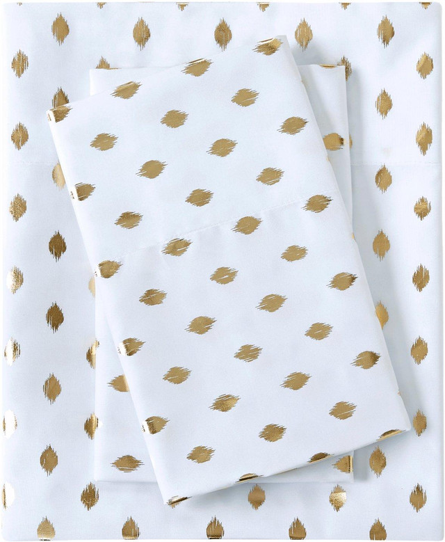 Intelligent Design Microfiber Sheet Set features soft and smooth polyester microfiber fabric that is lightweight and a fashionable metallic smudged dot print that will add glam to your bedroom. Fitted sheet fits up to 16'' mattress. Set includes 1 flat sheet, 1 fitted sheet, and 2 pillow cases (1 twin).