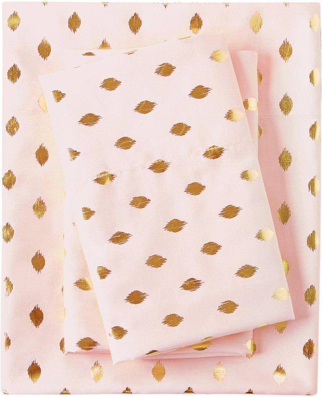 Intelligent Design Microfiber Sheet Set features soft and smooth polyester microfiber fabric that is lightweight and a fashionable metallic smudged dot print that will add glam to your bedroom. Fitted sheet fits up to 16'' mattress. Set includes 1 flat sheet, 1 fitted sheet, and 2 pillow cases (1 twin).